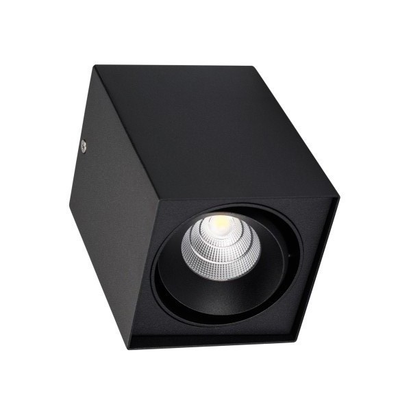 Накладной интерьерный светильник. Мощность 11 Вт, св. поток 830 лм, 75 лм/Вт, теплый 3000K, CRI>90, угол 40°, регулируемое направление луча 30°, напряжение питания 230 В. Черный квадратный корпус из алюминия, степень защиты IP20. Размер: длина 100 мм, ширина 100 мм, высота 135 мм. Монтаж накладной. Драйвер 18-24 В, 500 мА, пульсация <5%.